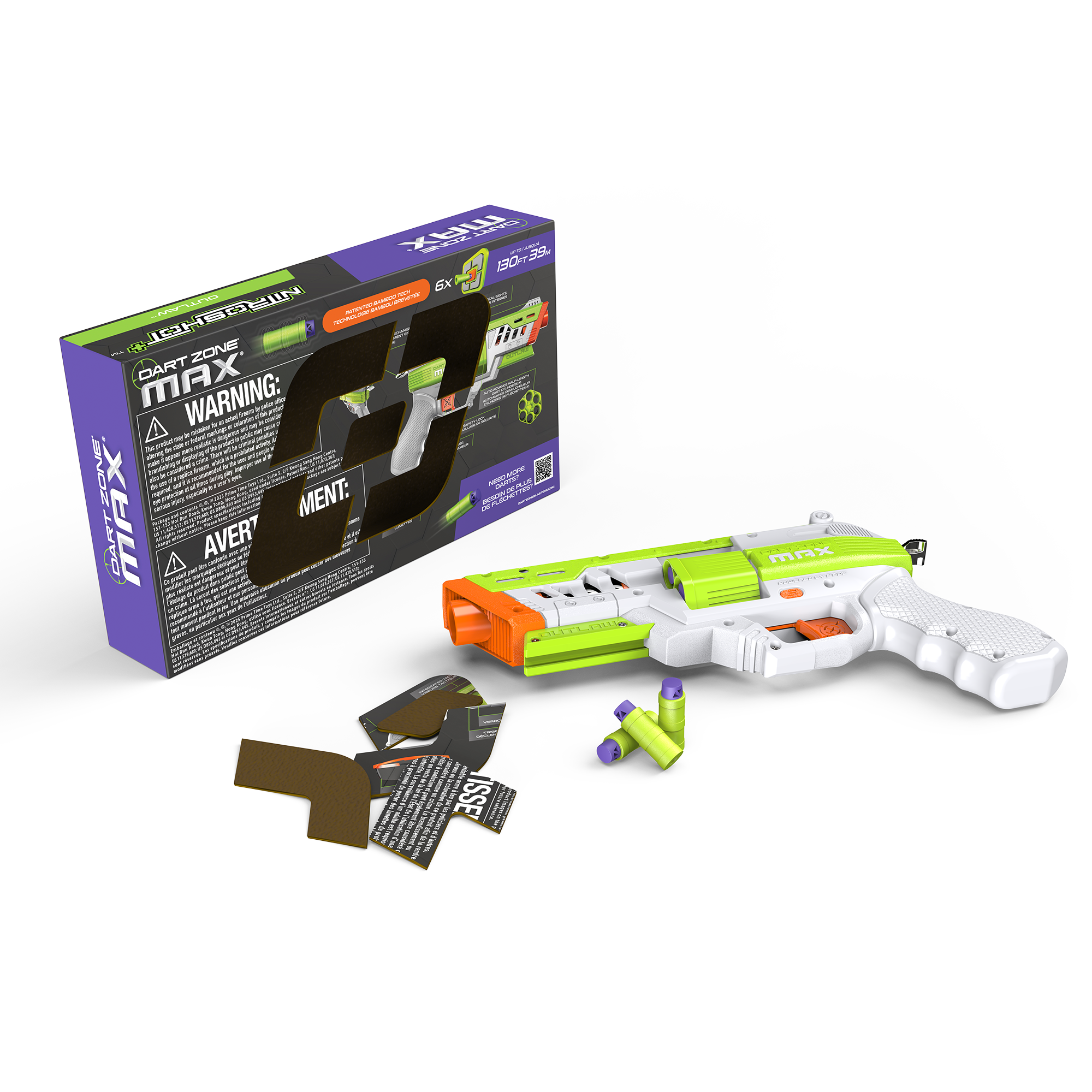 Load up with the included 6 half-length Dart Zone Nitroshot+ Half-Length Darts and fire with unmatched accuracy, reaching distances of up to 130 feet. The blaster’s ergonomic design includes integrated tactical sights for pinpoint precision and a sleek silhouette in bold Green or Blue finishes. Safety is built in, with a dependable lock mechanism and Max Eyewear Gear included for ultimate peace of mind. The Dart Zone Max Nitroshot+ Outlaw is your ultimate companion for dominating the foam dart battlefield. Recommended for players ages 14 and up.