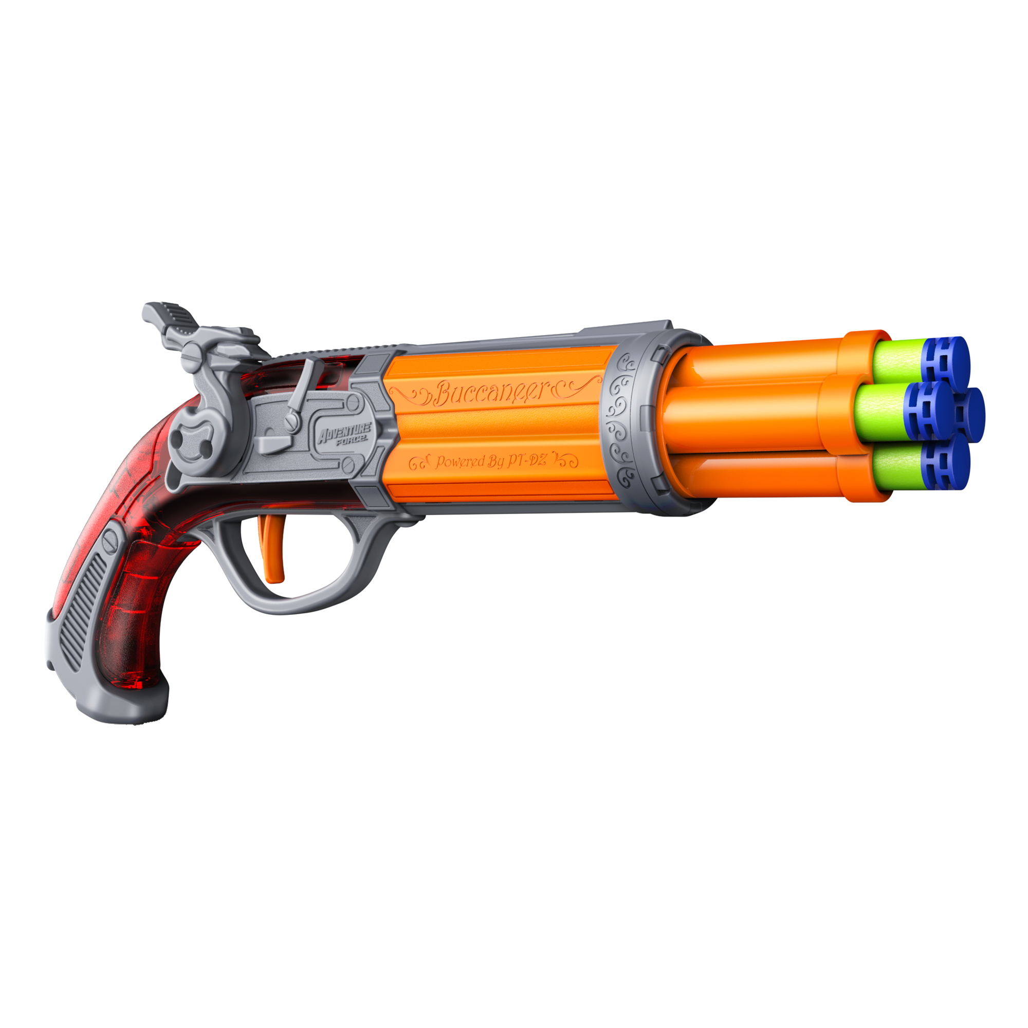 The Buccaneer dart blaster features authentic flint-lock styling with an auto-rotating cylinder that blasts foam darts up to 70 feet. Paired with the included foam pirate sword, kids can duel, defend, and swashbuckle with safe, action-packed fun. The full package includes the foam-dart blaster, foam sword, pirate hat, play compass, 2 play coins, and an extendable play telescope. With everything included, the Buccaneer Dart Blaster & Pirate Role Play Set turns your backyard into a pirate's playground.
