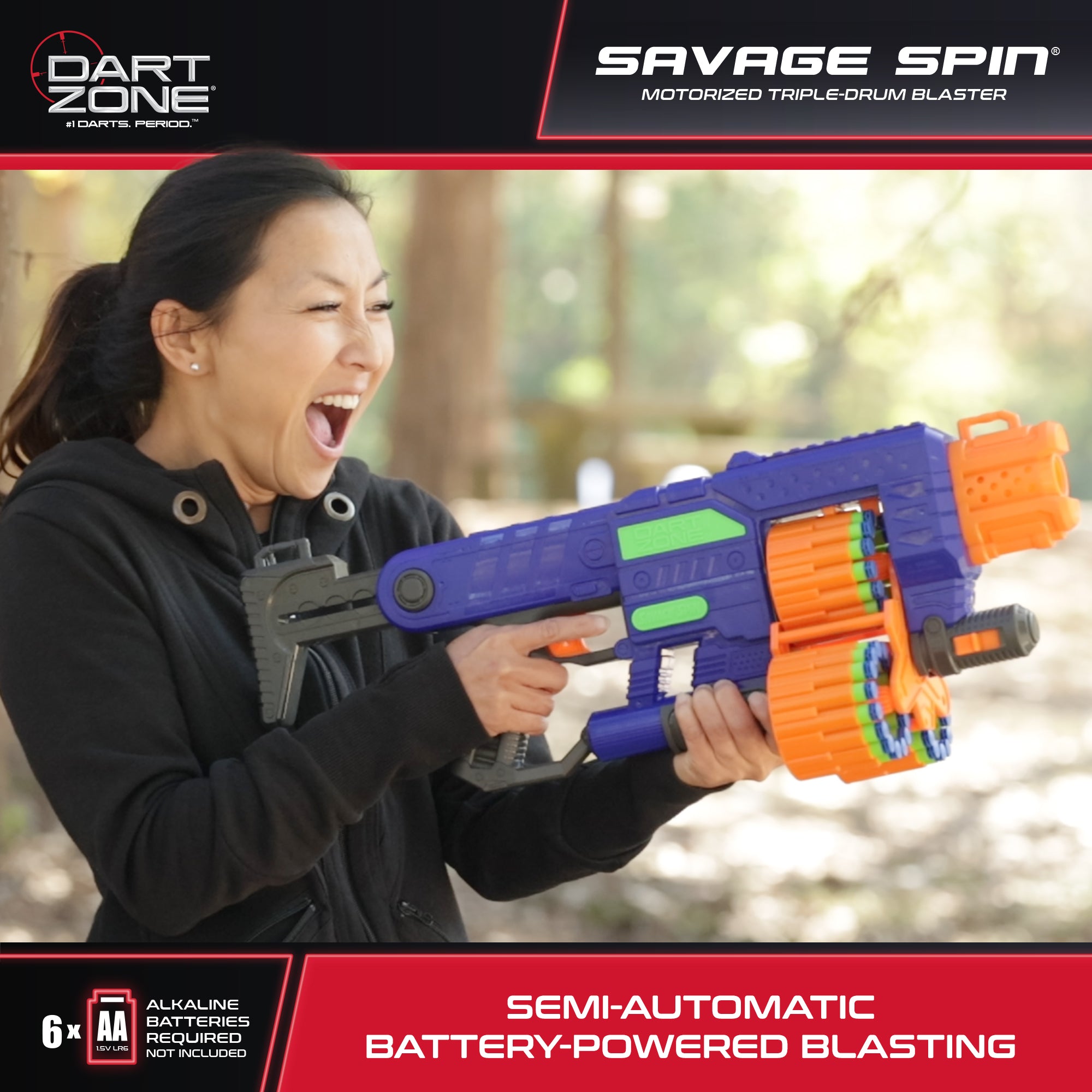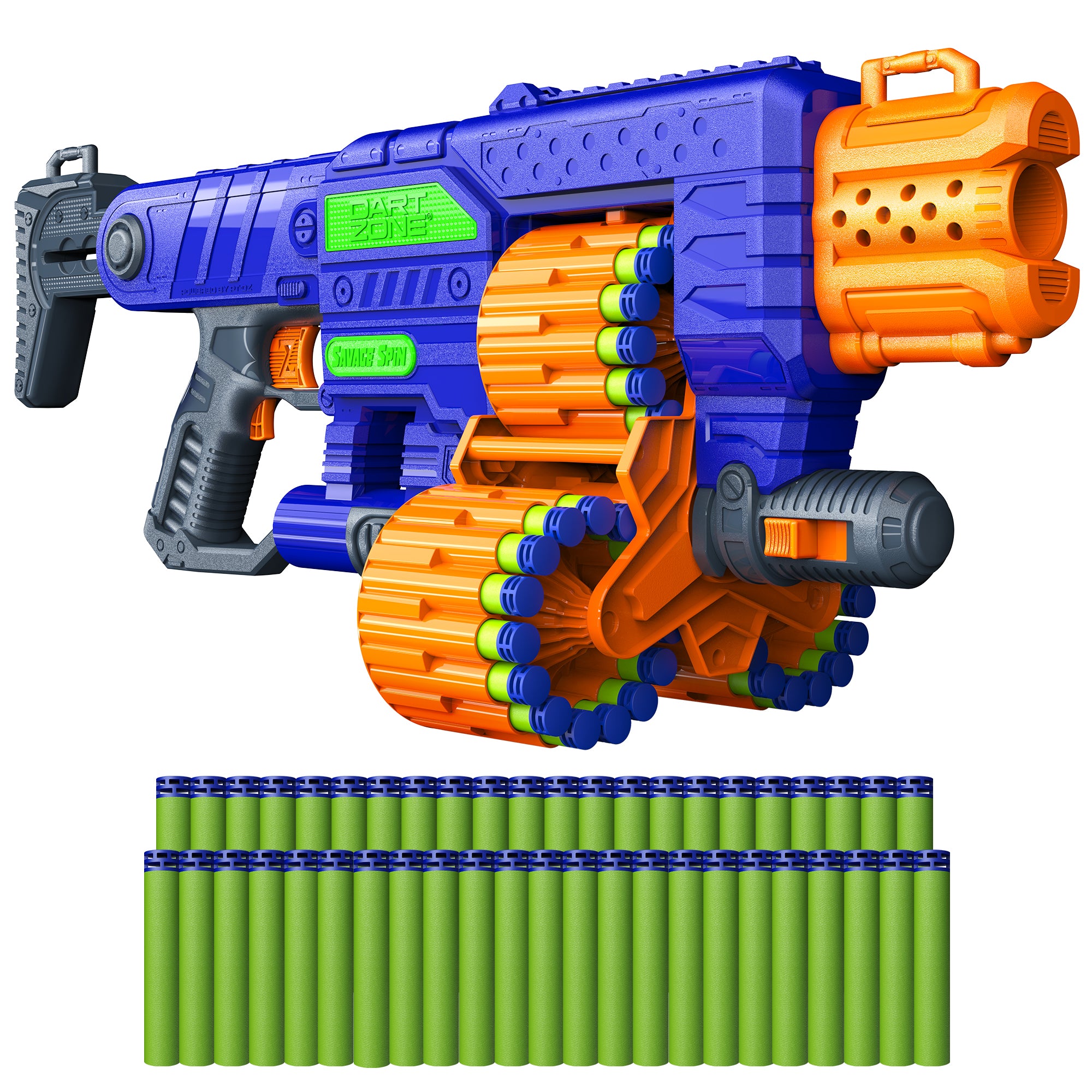 Take aim with the Dart Zone Savage Spin foam dart blaster—the ultimate triple-drum launcher for high-energy backyard battles. This motorized blaster comes packed with a 45-dart capacity and launches darts up to 80 feet, delivering fast, powerful, and action-packed play. The Savage Spin features three auto-advancing rotating drums for nonstop blasting. Forget frequent reloads—just press the Rev-Trigger to power up the flywheels, then fire with the primary trigger for rapid, continuous shots. Comfort meets control with the telescoping tactical stock, which extends up to 2 feet for a customized, stable fit. Whether you're defending your turf or making a move, this adjustable stock adds support when it counts. Included in the set are 45 Dart Zone Waffle Tip Darts, designed for accuracy and smooth flight. Made from soft foam and featuring a textured tip, these darts are compatible with all Dart Zone blasters and most standard dart blasters from leading brands. Whether you're playing solo or in a team, the Savage Spin delivers screen-free fun that keeps the action going. With its bold look and high-capacity drum system, it’s built for everything from backyard battles to birthday parties. This blaster is perfect for players who want to stay in the game longer—and blast harder.