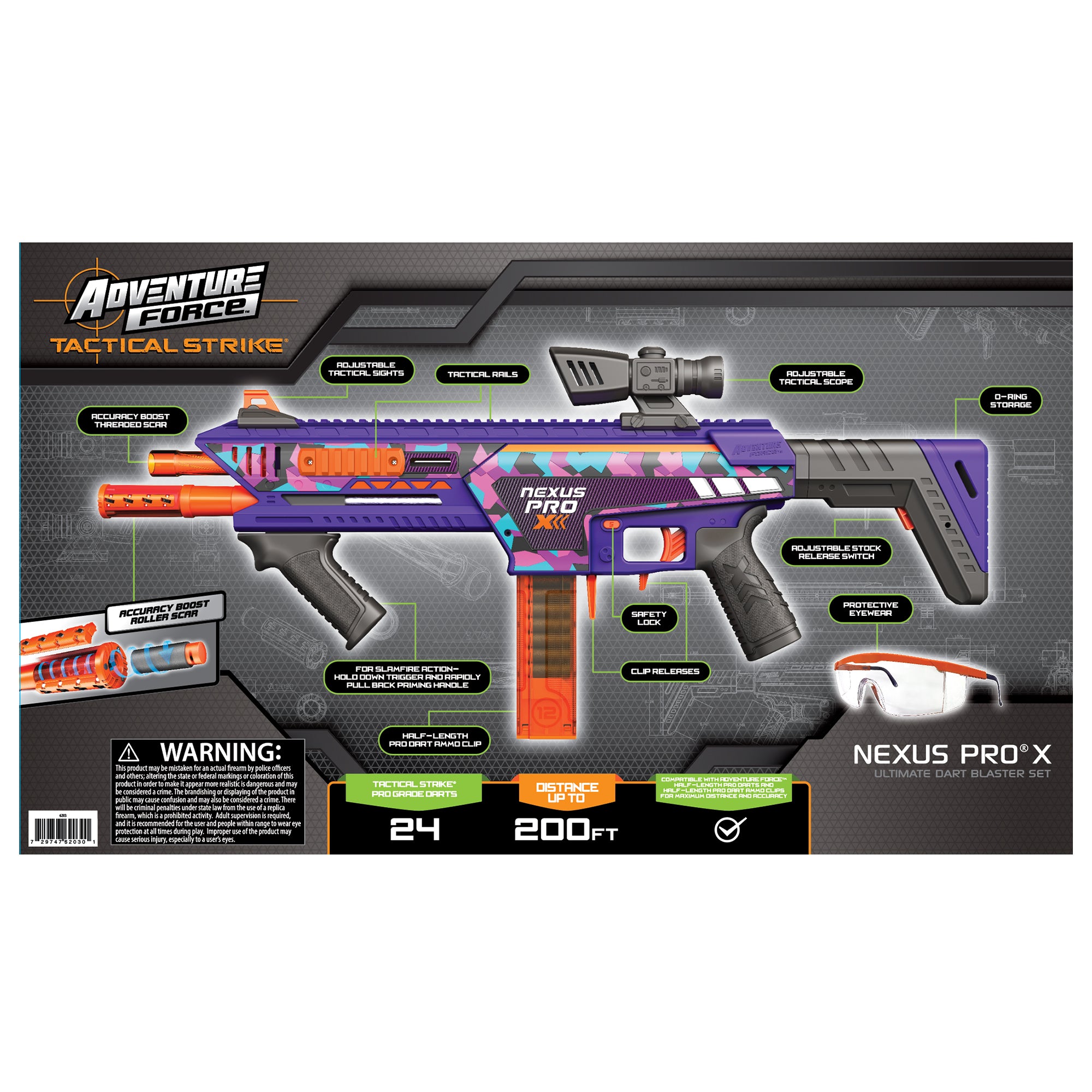 Adventure Force Tactical Strike Nexus Pro X Ultimate Dart Blaster delivers Pro blasting power and performance right out of the box. This Nexus Pro X is designed for ultimate speed, distance, and accuracy. The set includes 24 of the highly-accurate half-length Adventure Force Pro Darts that can shoot up to 200 feet. Activate rapid Slamfire Action, by holding down the trigger and continuously pulling back the priming slide. This blaster also includes two SCAR Barrel Tubes to boost accuracy and help you customize your blasting experience. Recommended for ages 14+. Available only at Wal-Mart and Wal-Mart.com.