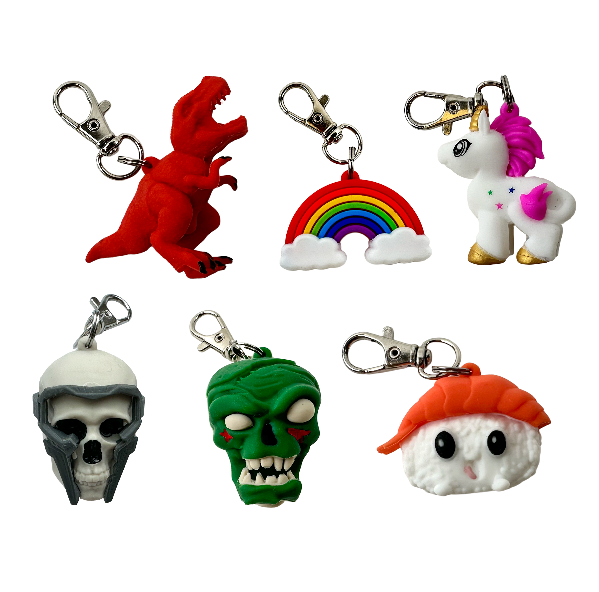 - Six Bold Characters – Sushi, Rainbow, T-Rex, Skull w/ Mask, Zombie, and Unicorn, each with their own personality.