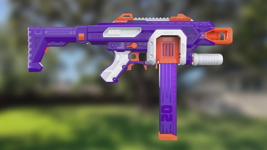 With adjustable FPS, full semi-auto firing modes, and a new high-precision flywheel accuracy cage, every shot is for speed and consistency. Customize your setup with the included detachable stock and angled foregrip, then load up with the 40 Half-Length Adventure Force™ Pro Darts included in the box. Whether battling indoors or dominating the field, the Axis Switch Pro delivers unmatched power and versatility.