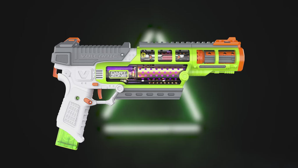Dominate the field with the Dart Zone Max Nitroshot+ Volcanic Pro, a spring-powered pro-level blaster engineered for speed, precision, and nonstop action. Designed for competitive players and foam blaster enthusiasts, the Volcanic Pro combines customizable features with powerful performance that delivers every time you step into battle. Equipped with a mag-fed handle, this blaster allows for fast reloads and smooth gameplay. The slam-fire function ensures rapid-fire action, letting you unleash a stream of darts with a simple pump-and-hold motion. Plus, the included detachable BCAR accuracy booster gives you the freedom to switch between tight precision and fast-paced cover blasting, play your way, every time. The lower tactical rail opens the door to full customization, giving players the perfect spot for add-ons like Dart Zone Blaster Charms. With power to launch darts up to 150 feet, the Volcanic Pro offers the perfect mix of long-range performance and close-quarters speed. Each set comes with everything you need to gear up and get blasting, including two 12-round half-length slanted magazines and 24 Dart Zone Nitroshot+ Half-Length Darts. Whether you’re a collector, competitor, or weekend player, the Volcanic Pro is built for reliability, accuracy, and next-level fun.